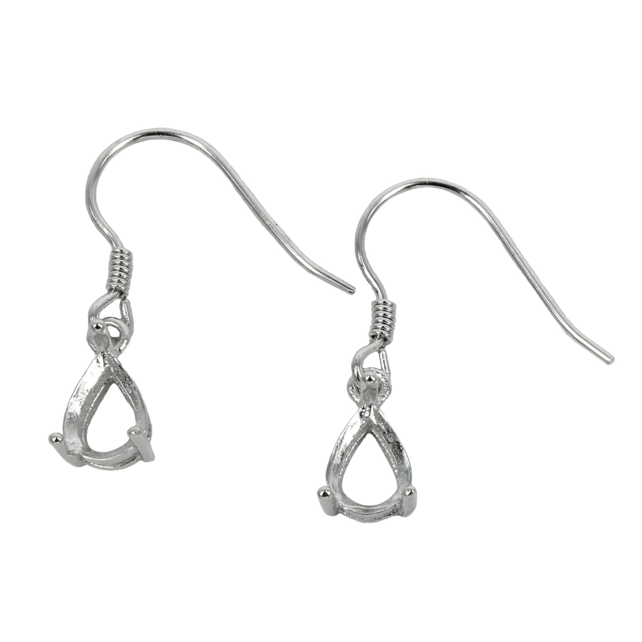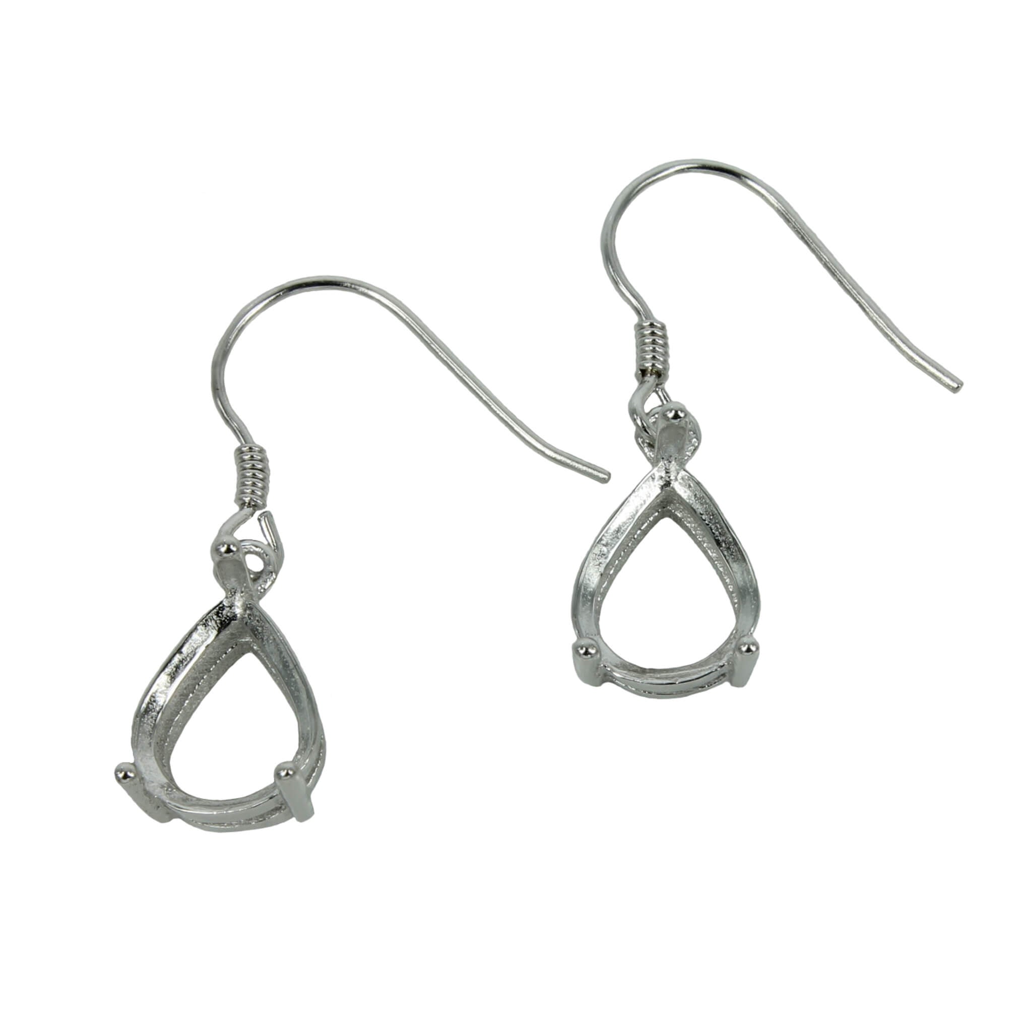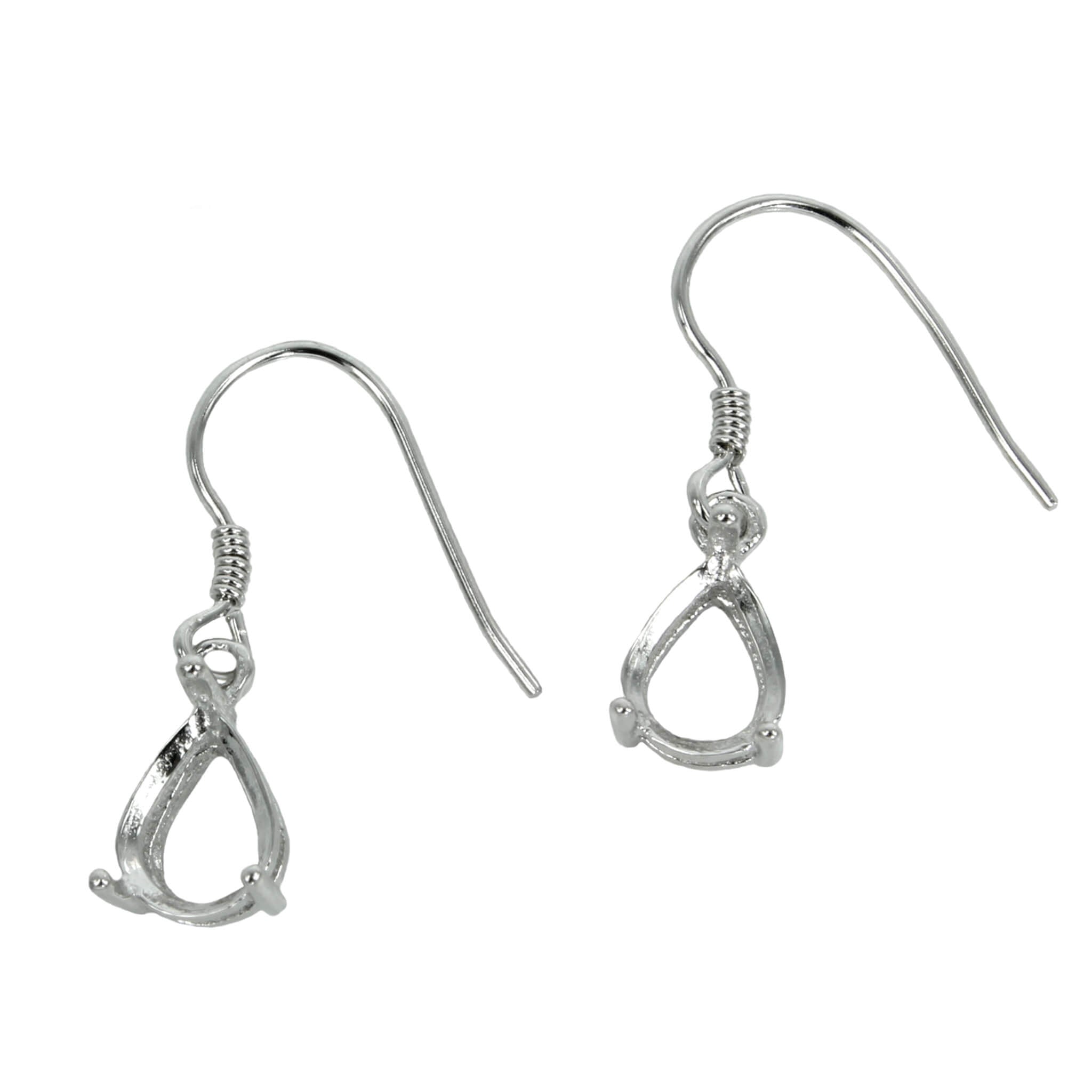 The sterling silver ear wires earrings settings feature a classic pear shape basket four-prongs mounting. The prongs mounting is calibrated for pear shape cabochons or cut stones. These are a unique choice for many jewelers, jewelry designers and artists for making fabulous earrings. The ear wire hook end passes through the pierced ear.