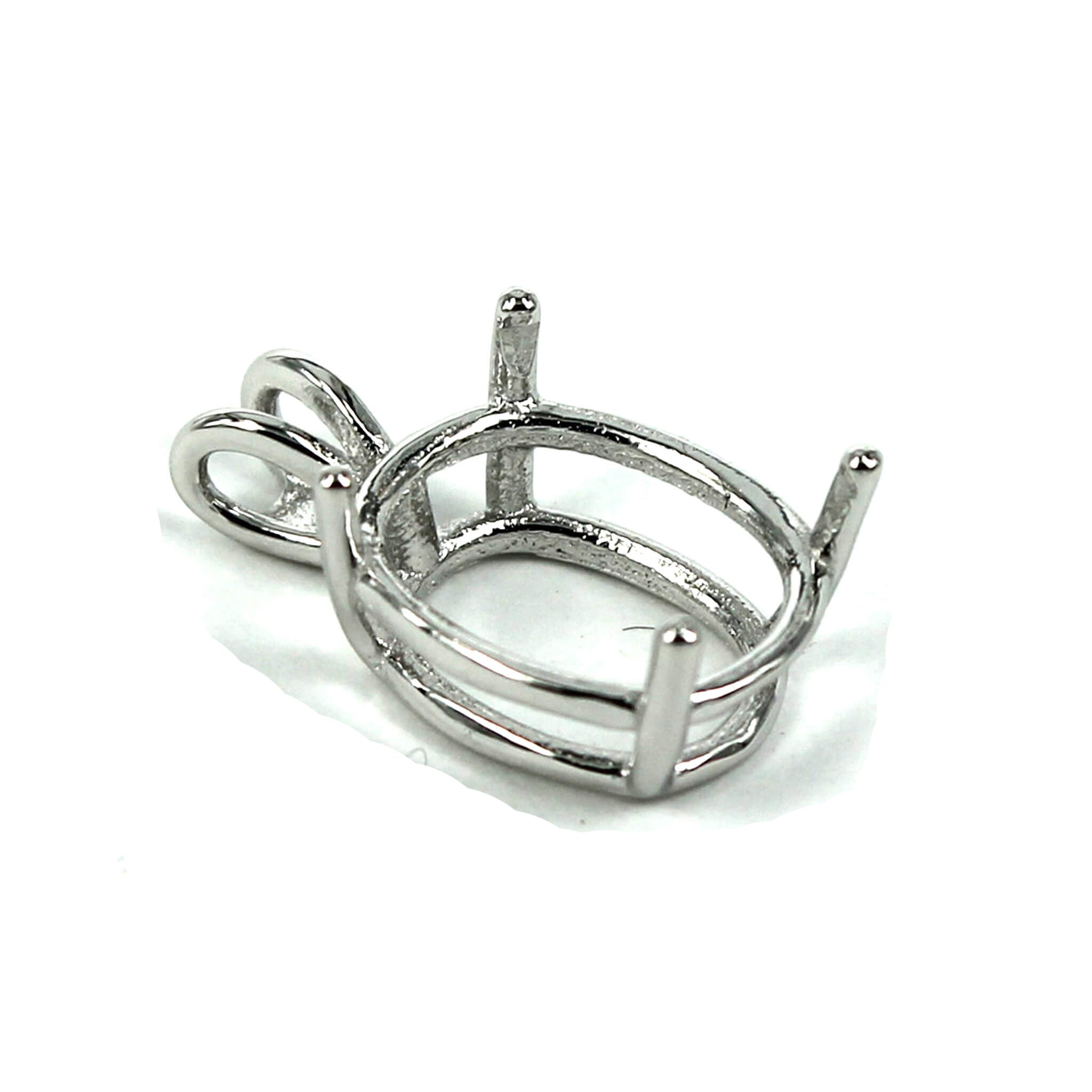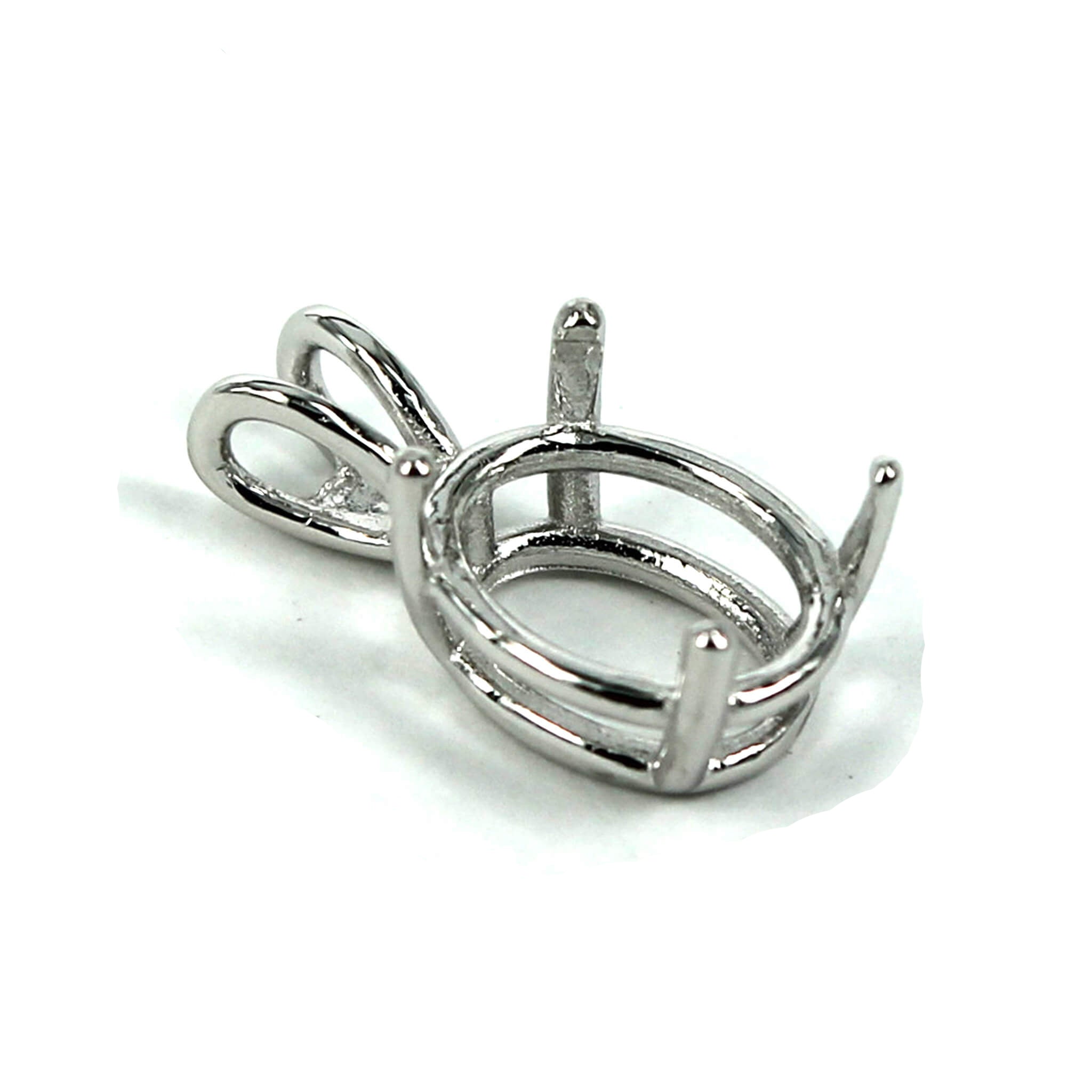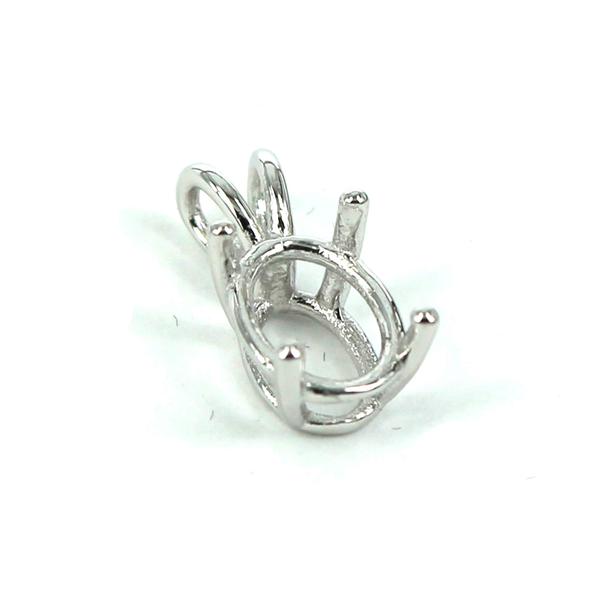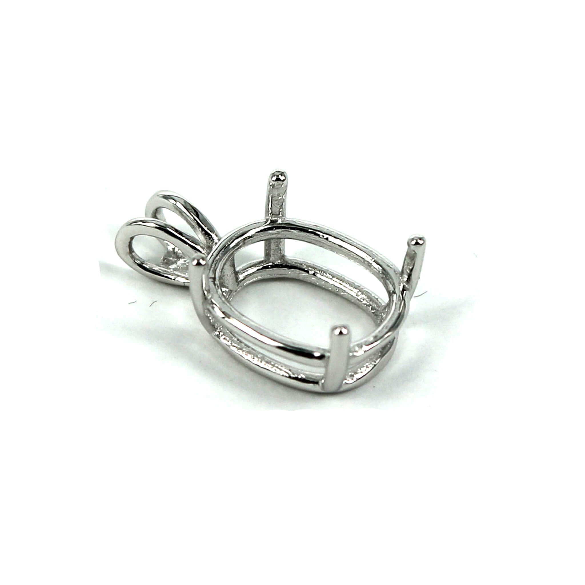 The sterling silver pendant has an elegant and smooth oval basket shape with split double "rabbit ear" style bail with a deep oval mounting and 4 prongs onto which you can set an oval stone. It is a popular choice for many jewelers, jewelry designers and artists to add beautiful and a true statement piece to their designs.