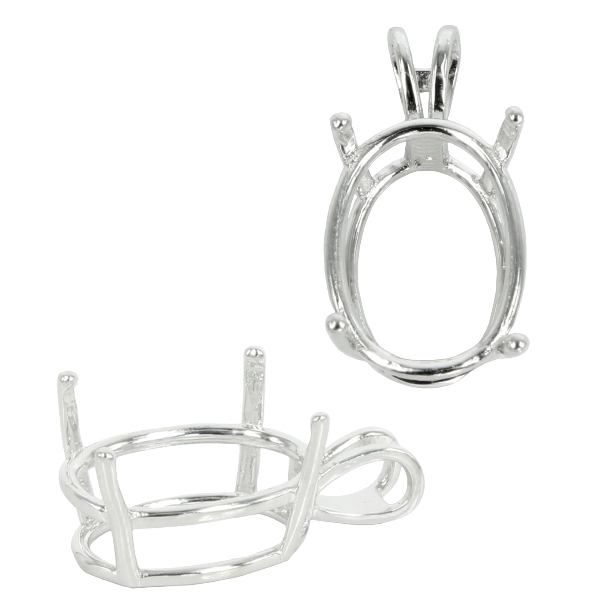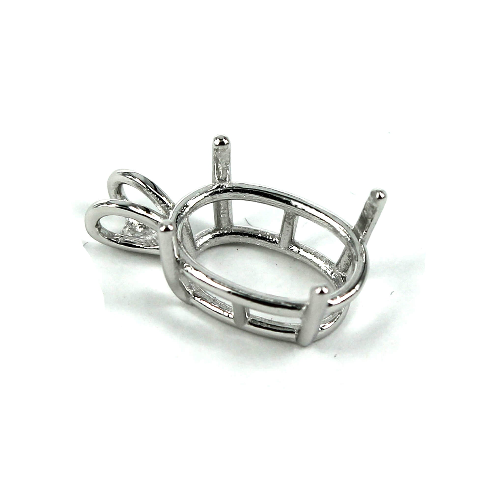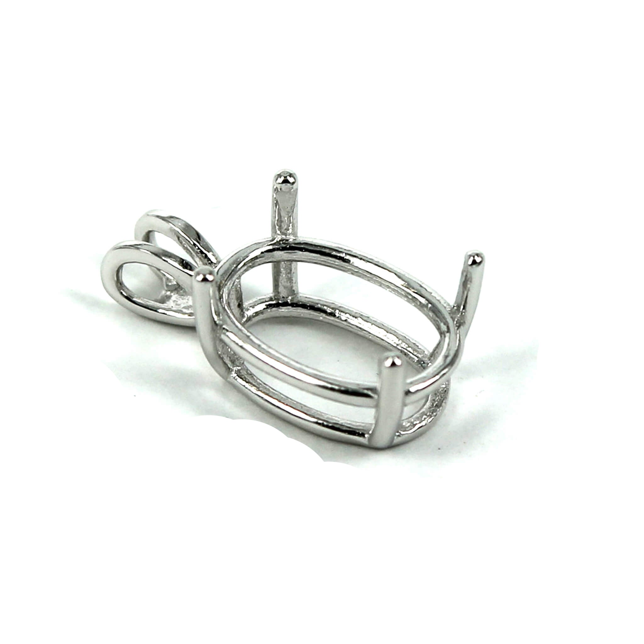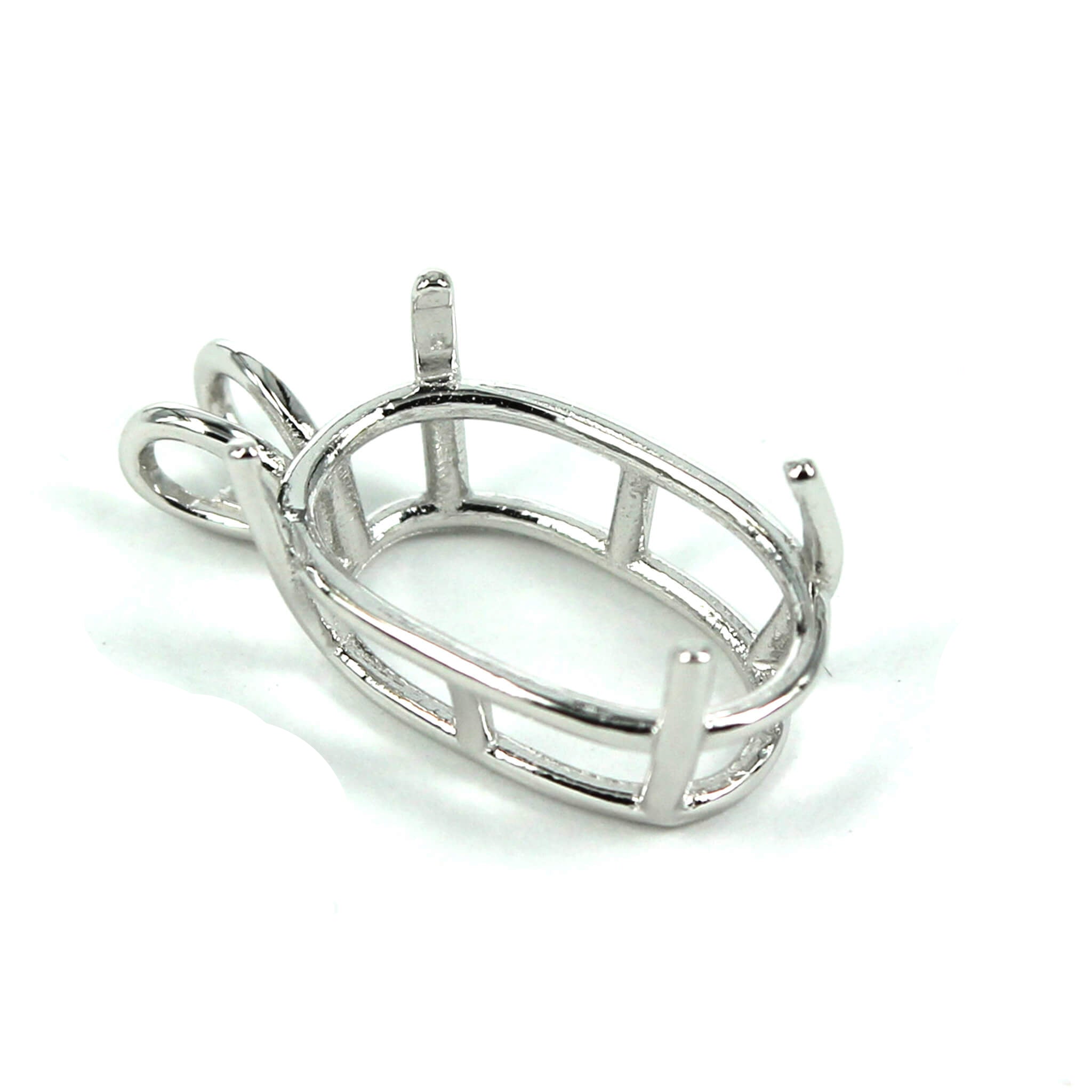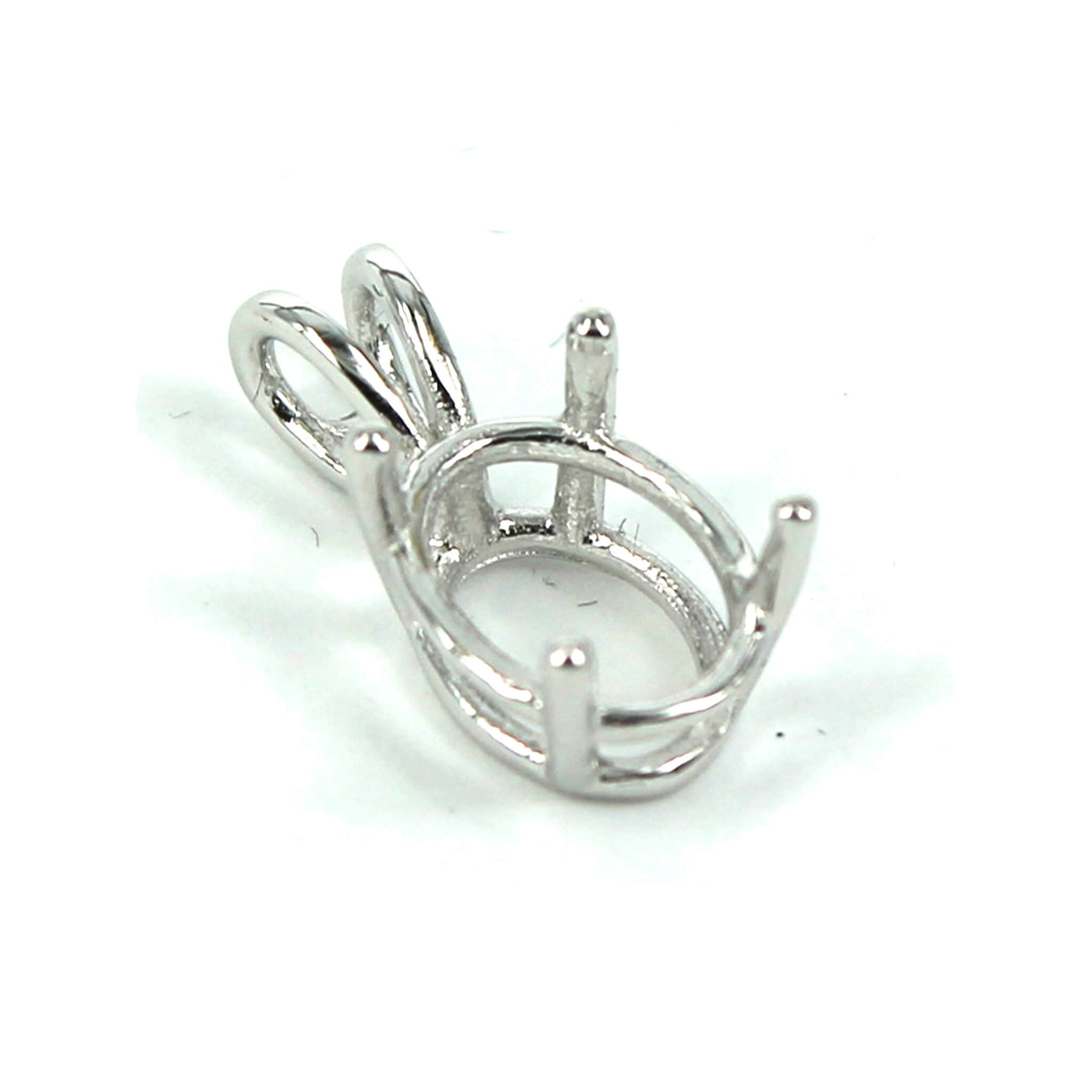 The sterling silver pendant has an elegant and smooth oval basket shape with split double "rabbit ear" style bail with a deep oval mounting and 4 prongs onto which you can set an oval stone. It is a popular choice for many jewelers, jewelry designers and artists to add beautiful and a true statement piece to their designs.