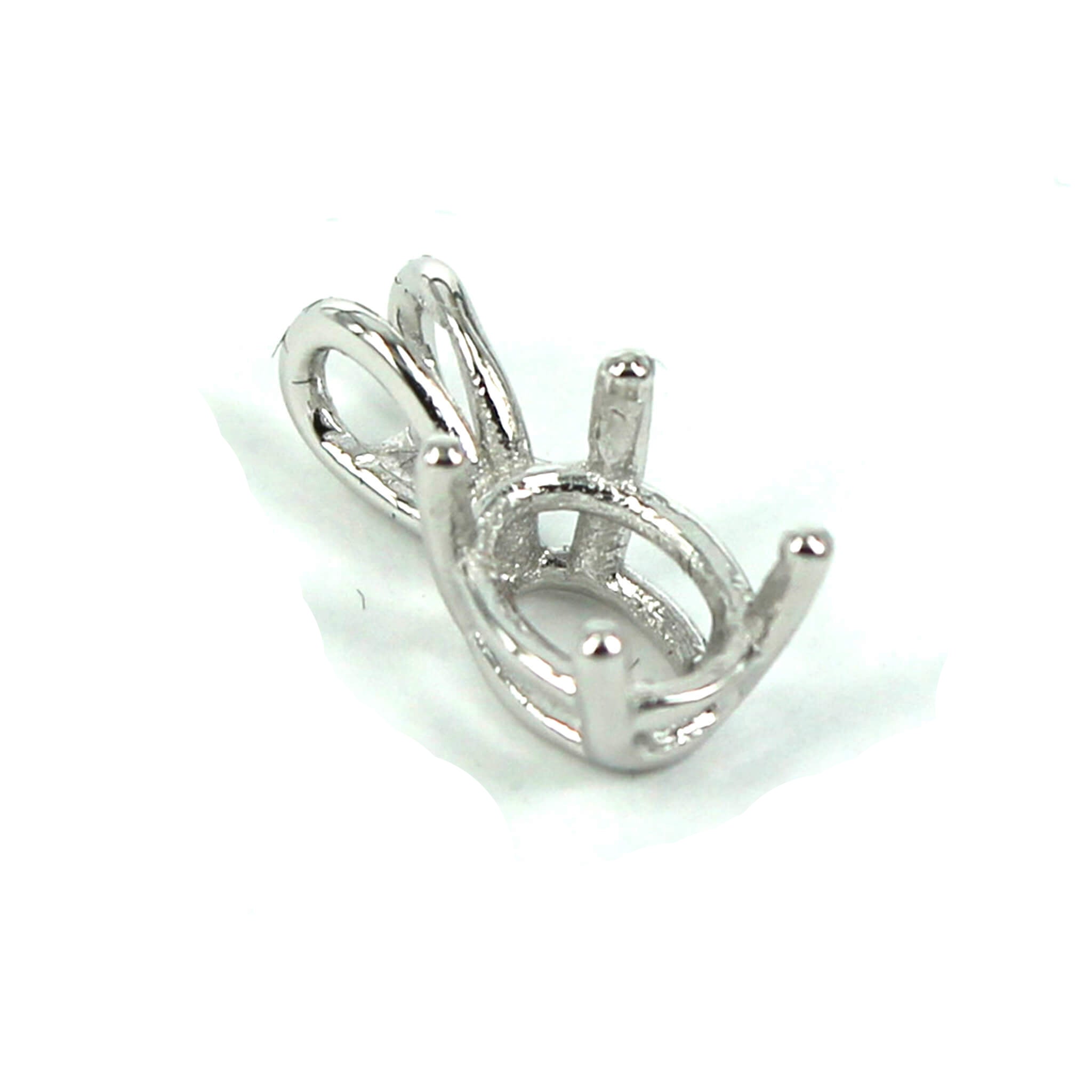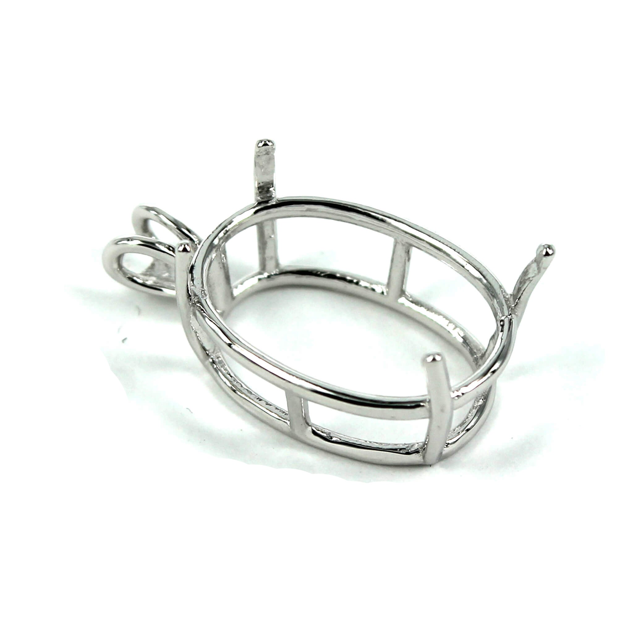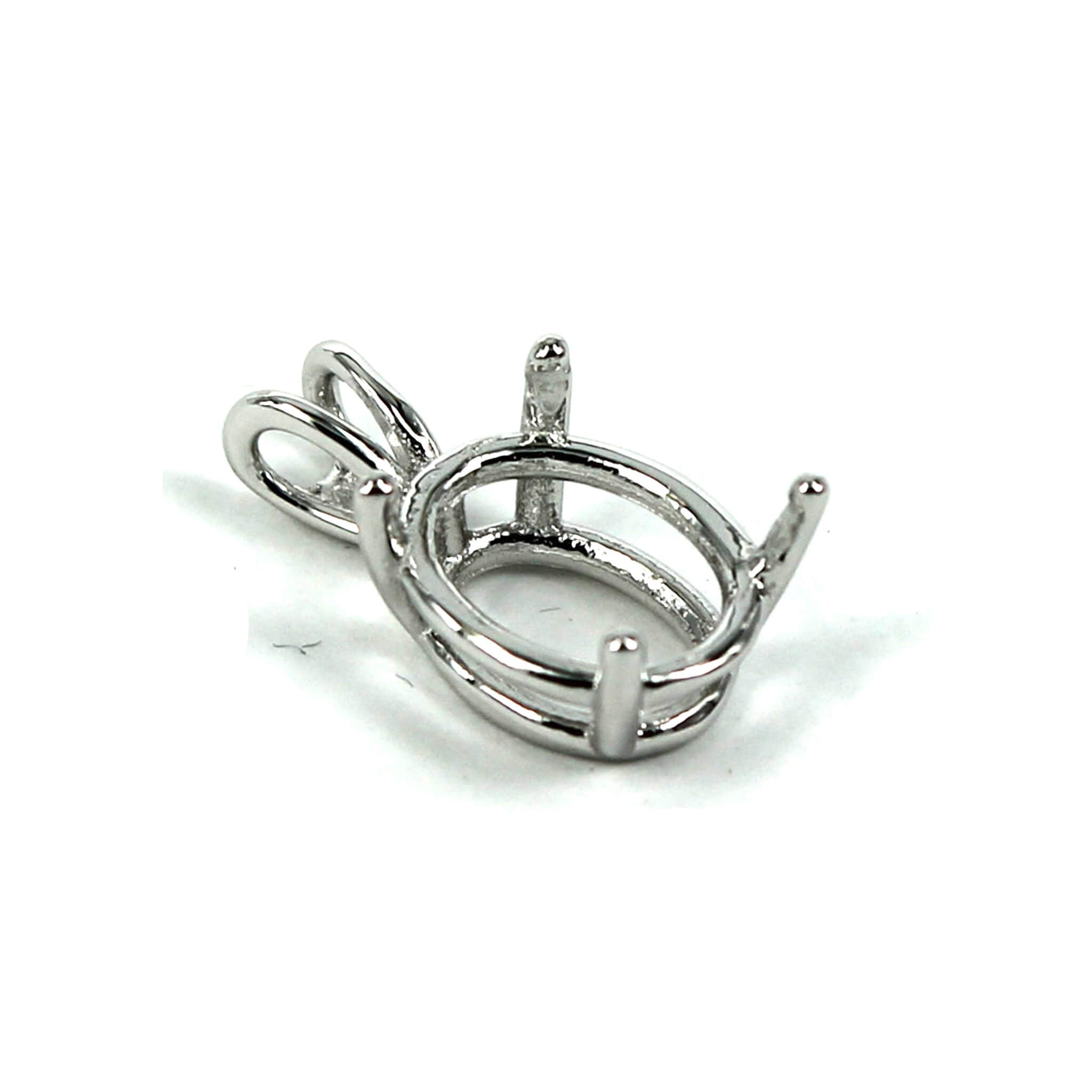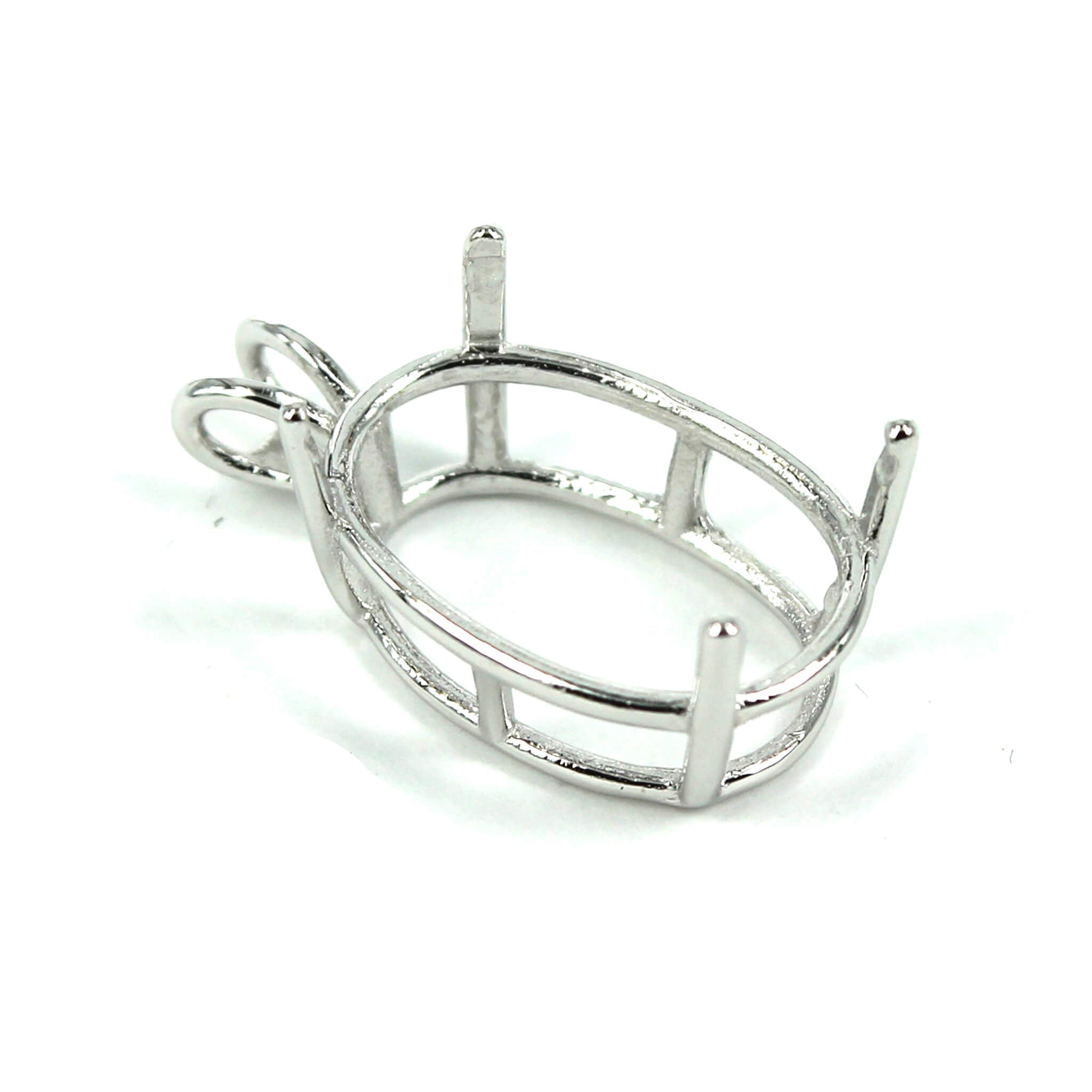 The sterling silver pendant has an elegant and smooth oval basket shape with split double "rabbit ear" style bail with a deep oval mounting and 4 prongs onto which you can set an oval stone. It is a popular choice for many jewelers, jewelry designers and artists to add beautiful and a true statement piece to their designs.