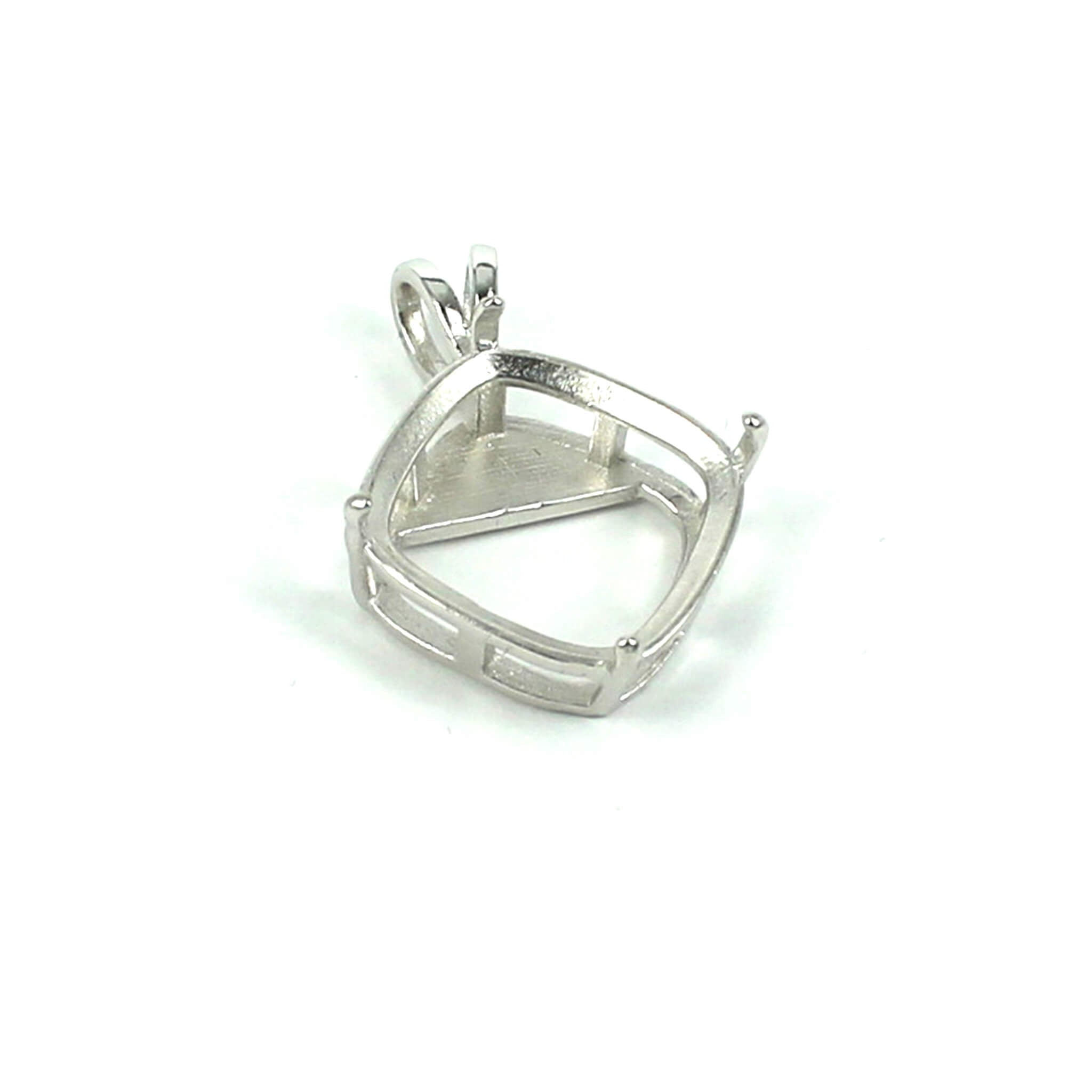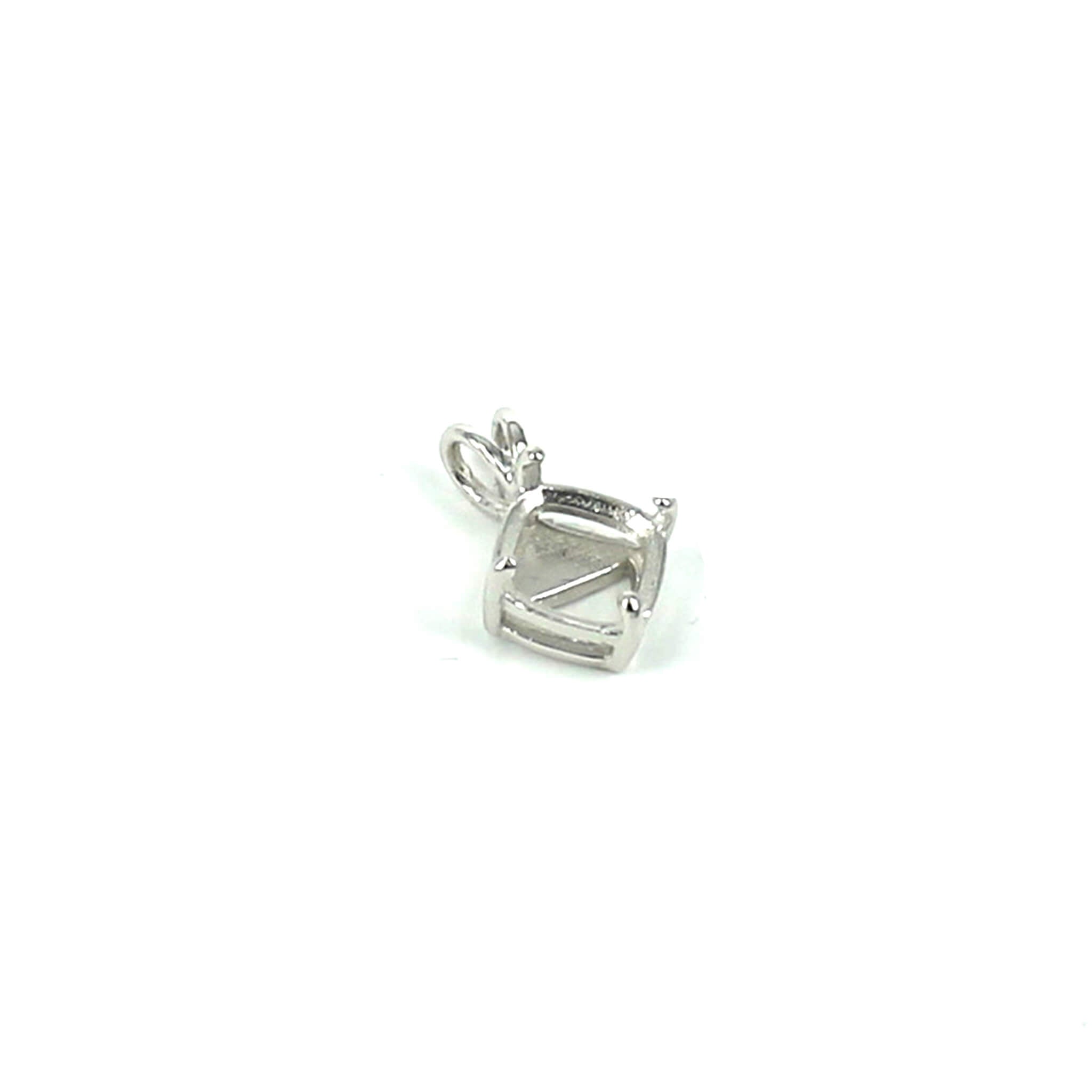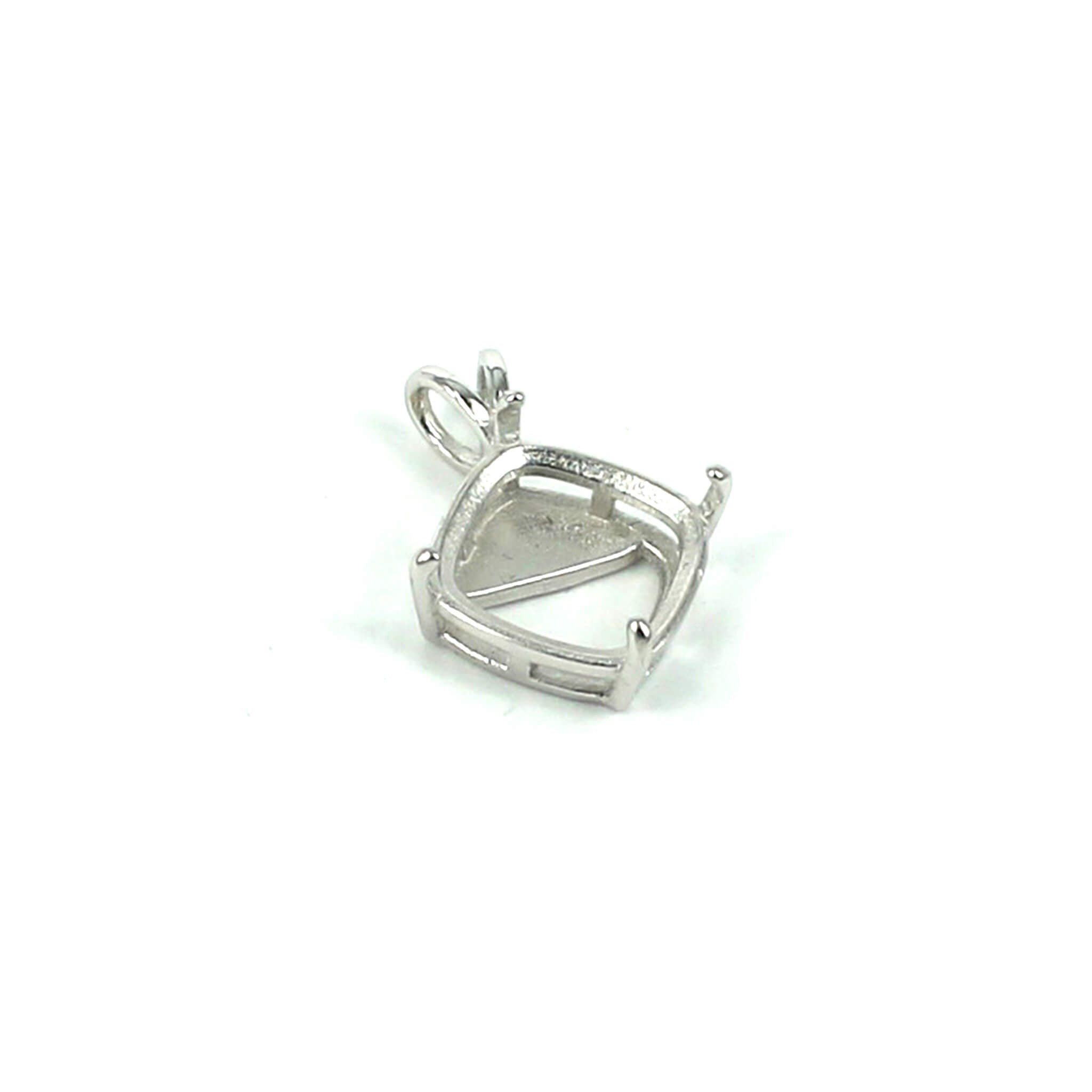 This sterling silver pendant pearl setting has a stylish and smooth square cushion cut deep basket shape with 4 prongs onto which you can set a square cushion cut stone. It features double "rabbit ear" style bail loops. It is a popular choice for many jewelers, jewelry designers and artists to add beautiful and a true statement piece to their designs.